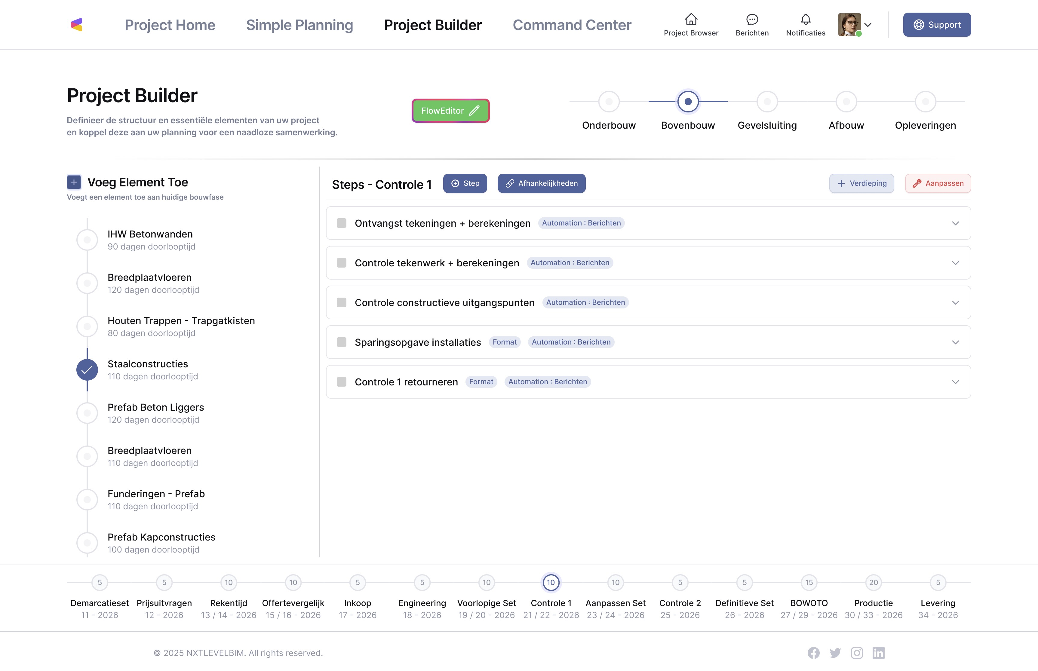 NodeFlows biedt vrijheid in het samenstellen van processen en workflows. Richt het platform volledig naar wens in met flexibele modules—passend bij elk uniek bouwproject.
