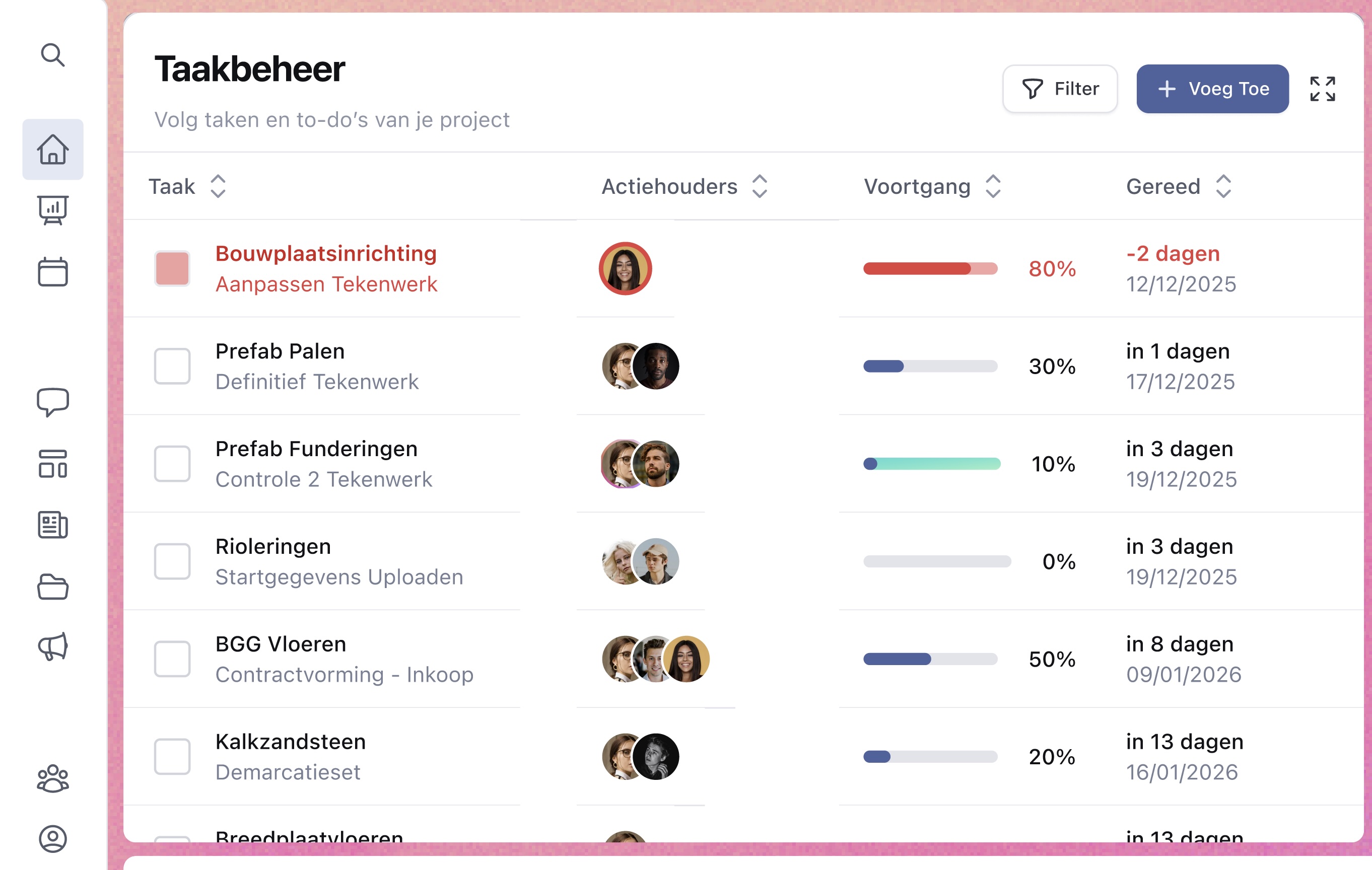 AutoComms automatiseert administratieve en repetitieve communicatietaken met slimme AI-ondersteuning. Conceptberichten, herinneringen en acties worden automatisch voorgesteld, waardoor relevante communicatie altijd tijdig bij de juiste personen terechtkomt. Het systeem waarschuwt ook proactief voor mogelijke vertragingen en escalaties, zodat projectteams zelfs in complexe of drukke periodes overzicht houden. Elke AI-suggestie blijft echter volledig controleerbaar en aanpasbaar, zodat jij altijd de eindregie behoudt terwijl efficiëntie en grip aanzienlijk toenemen.