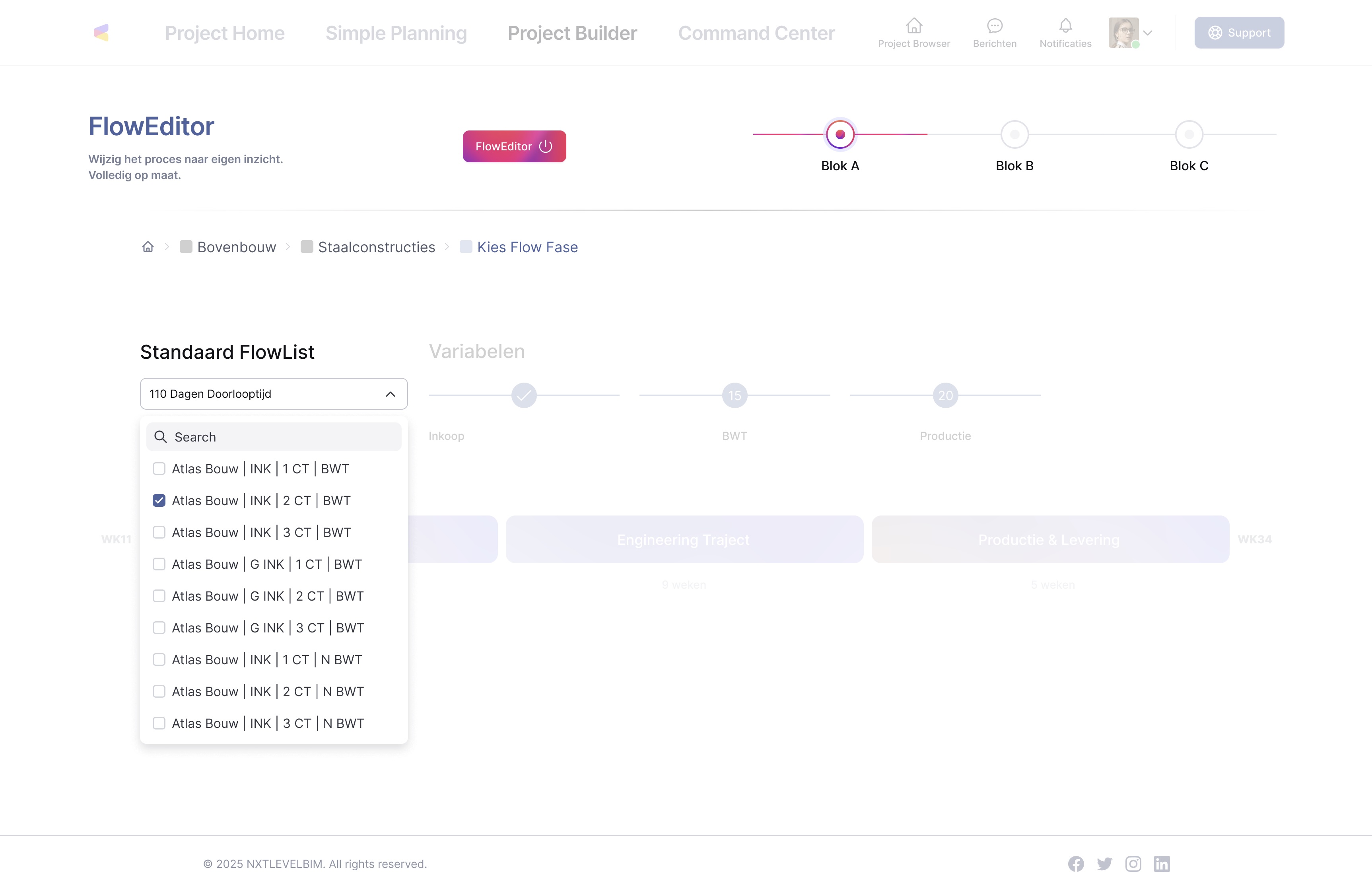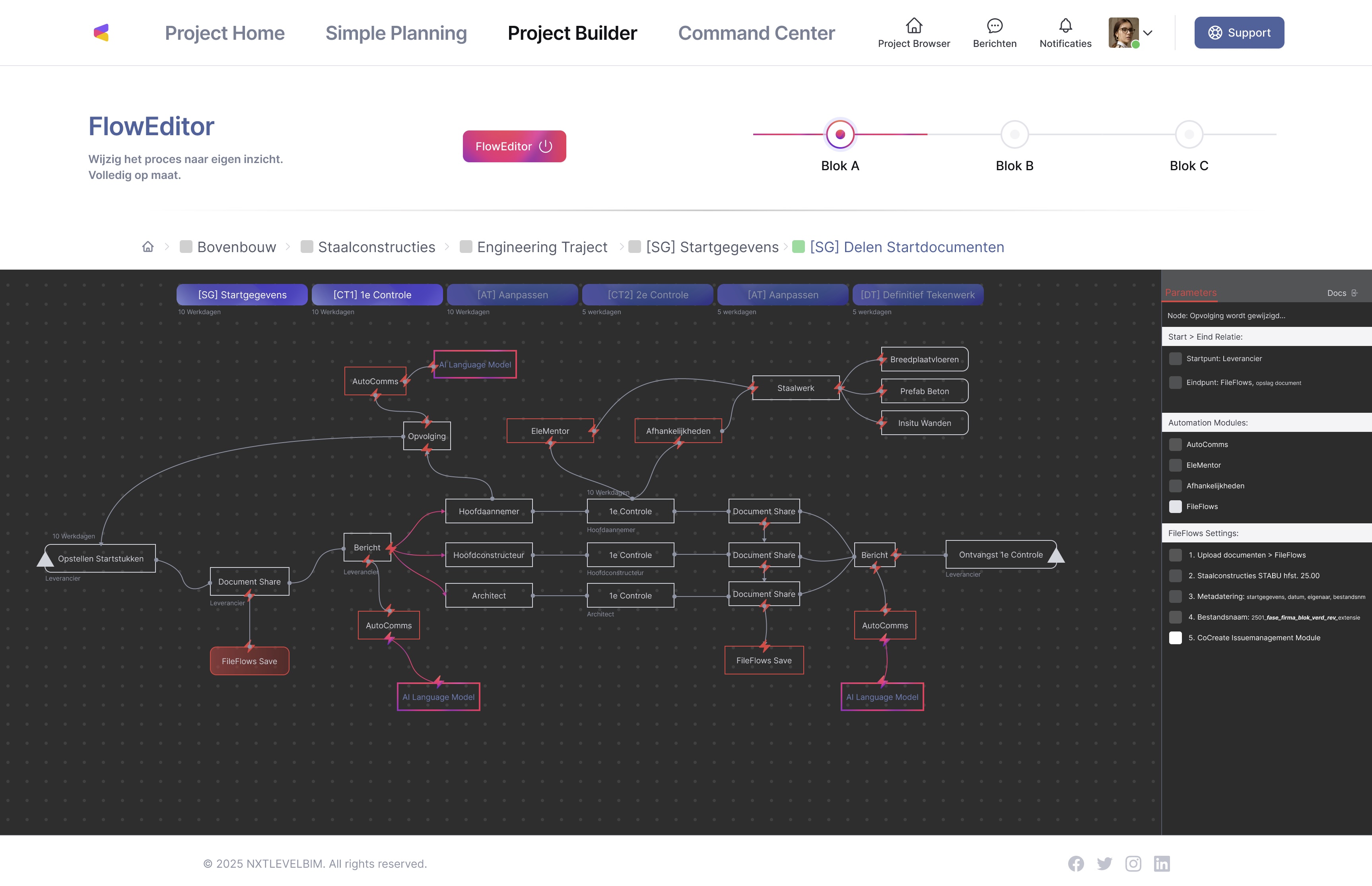 Engineeringstrajecten vragen vaak maatwerk. Met FlowEditor teken je bedrijfsspecifieke processen en unieke afhankelijkheden volledig uit, zonder statische Gantt-balken of Excel-staten. Je bepaalt exact welke teamleden input leveren, legt zelf of automatisch kritische verbanden, en identificeert proactief potentiële knelpunten. Zo creëer je duidelijkheid voor alle betrokkenen en voorkom je vertragingen door vroegtijdige afstemming.